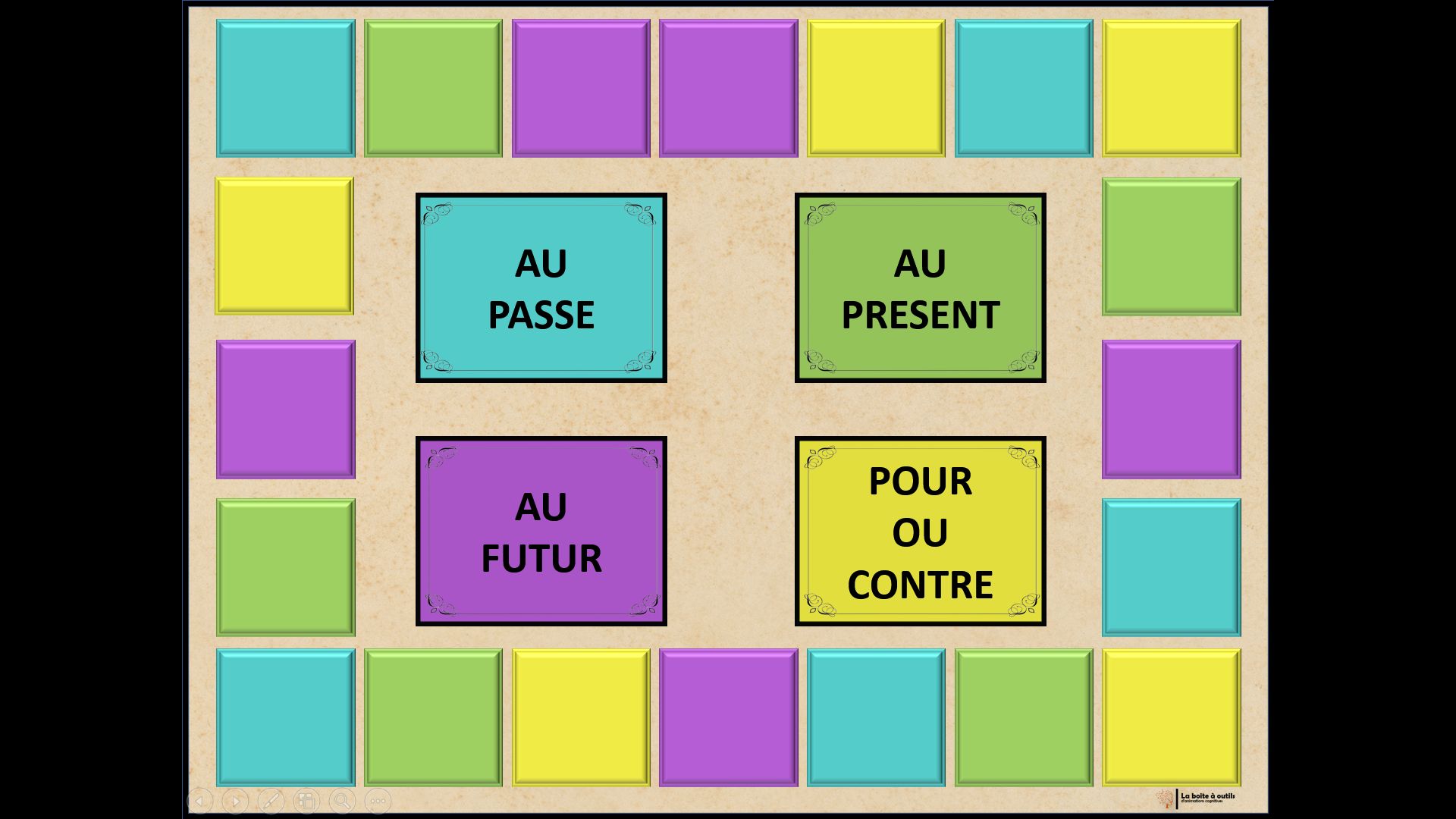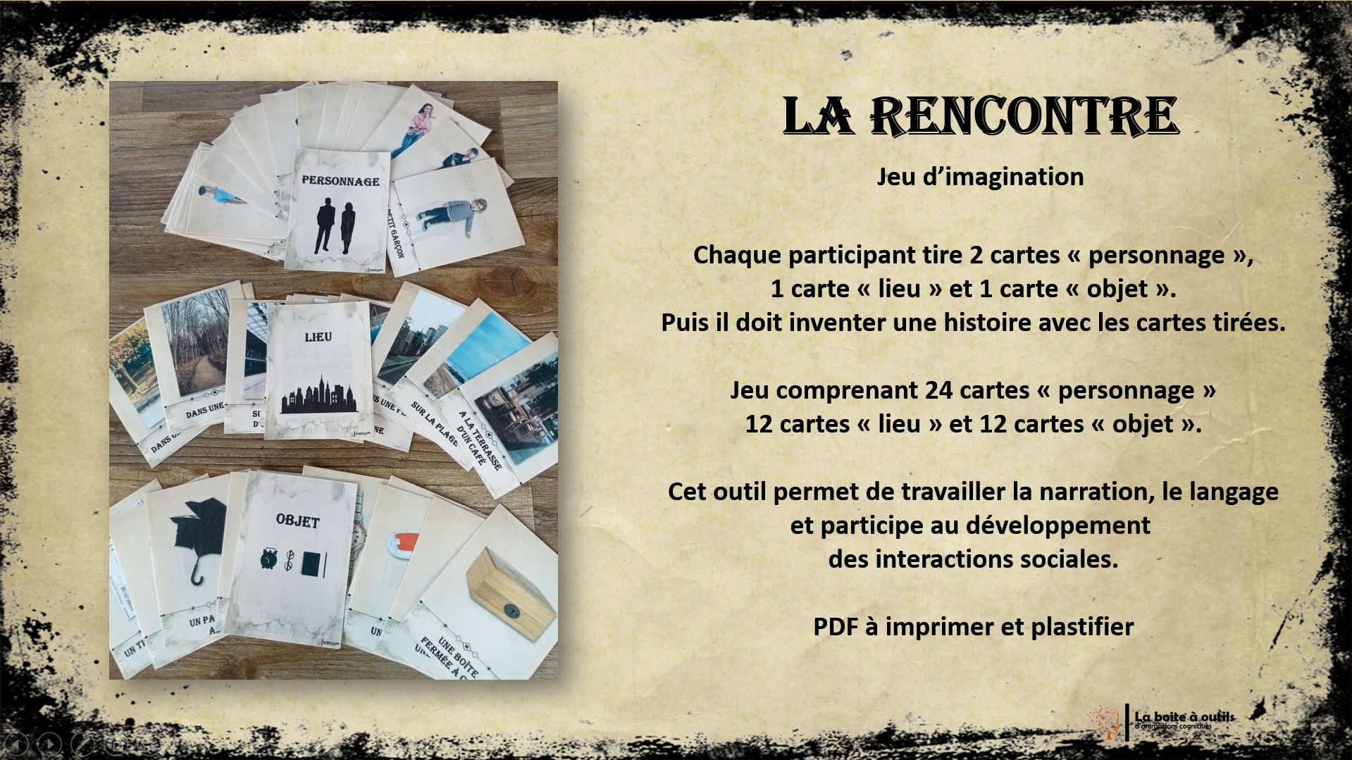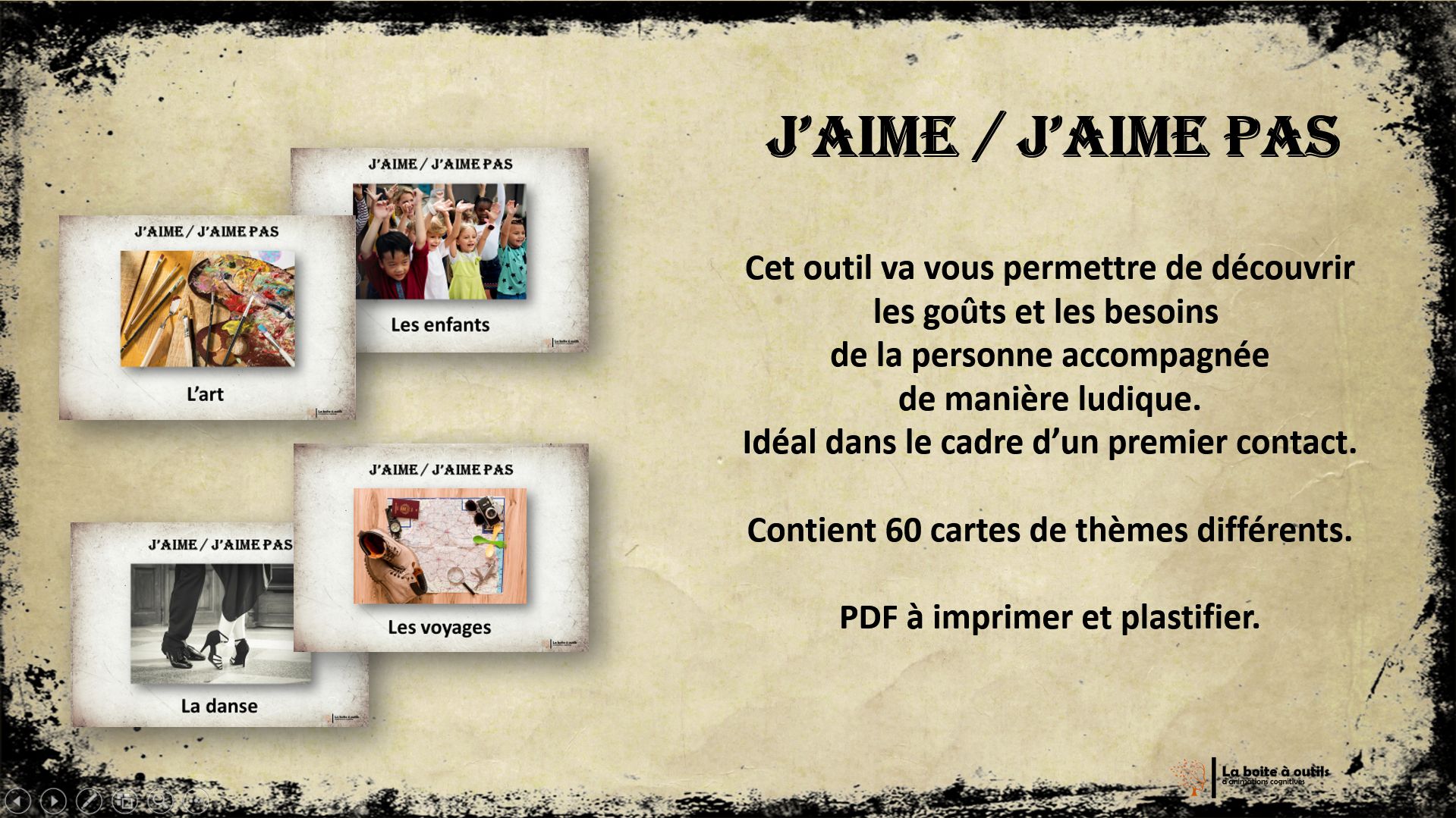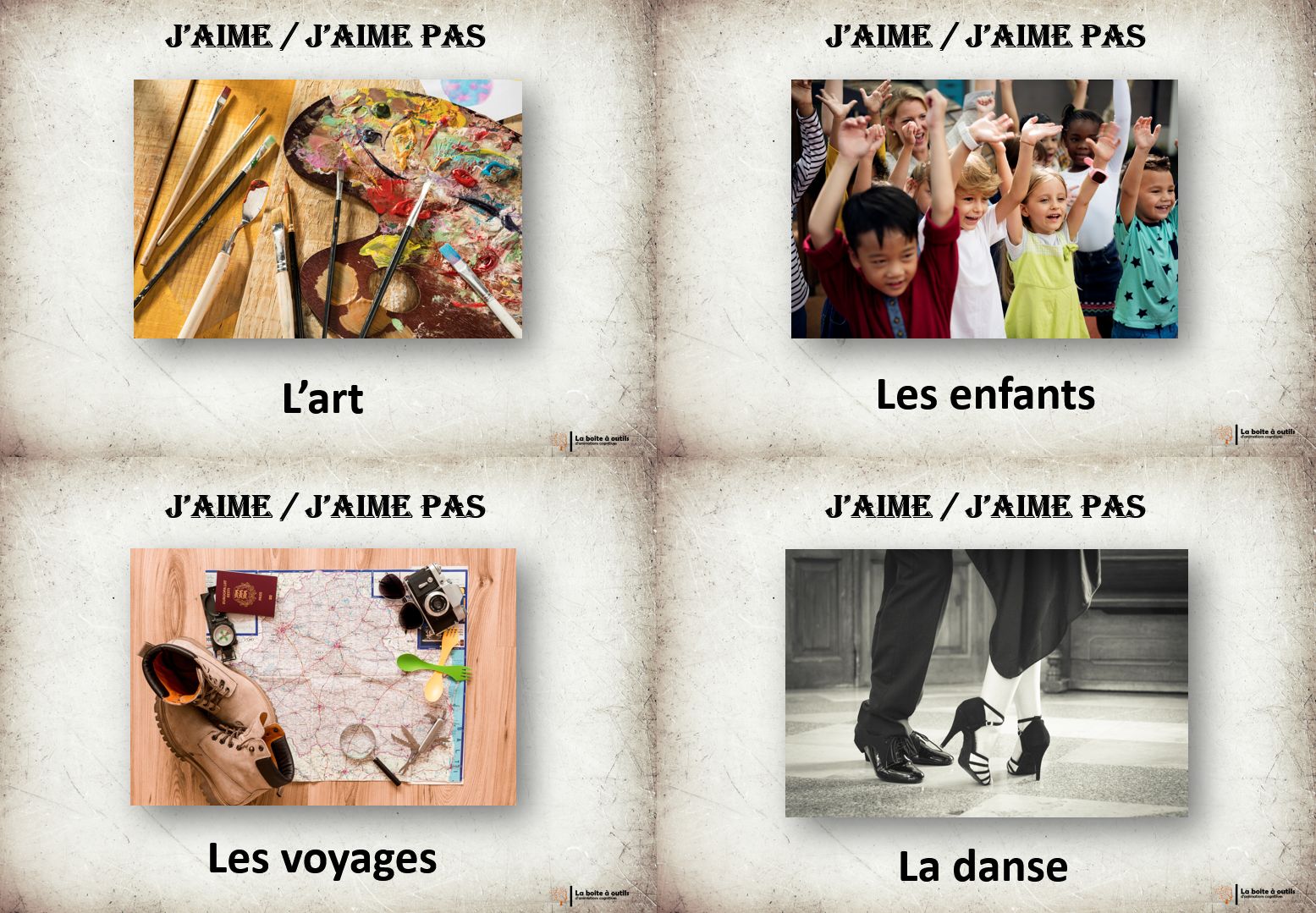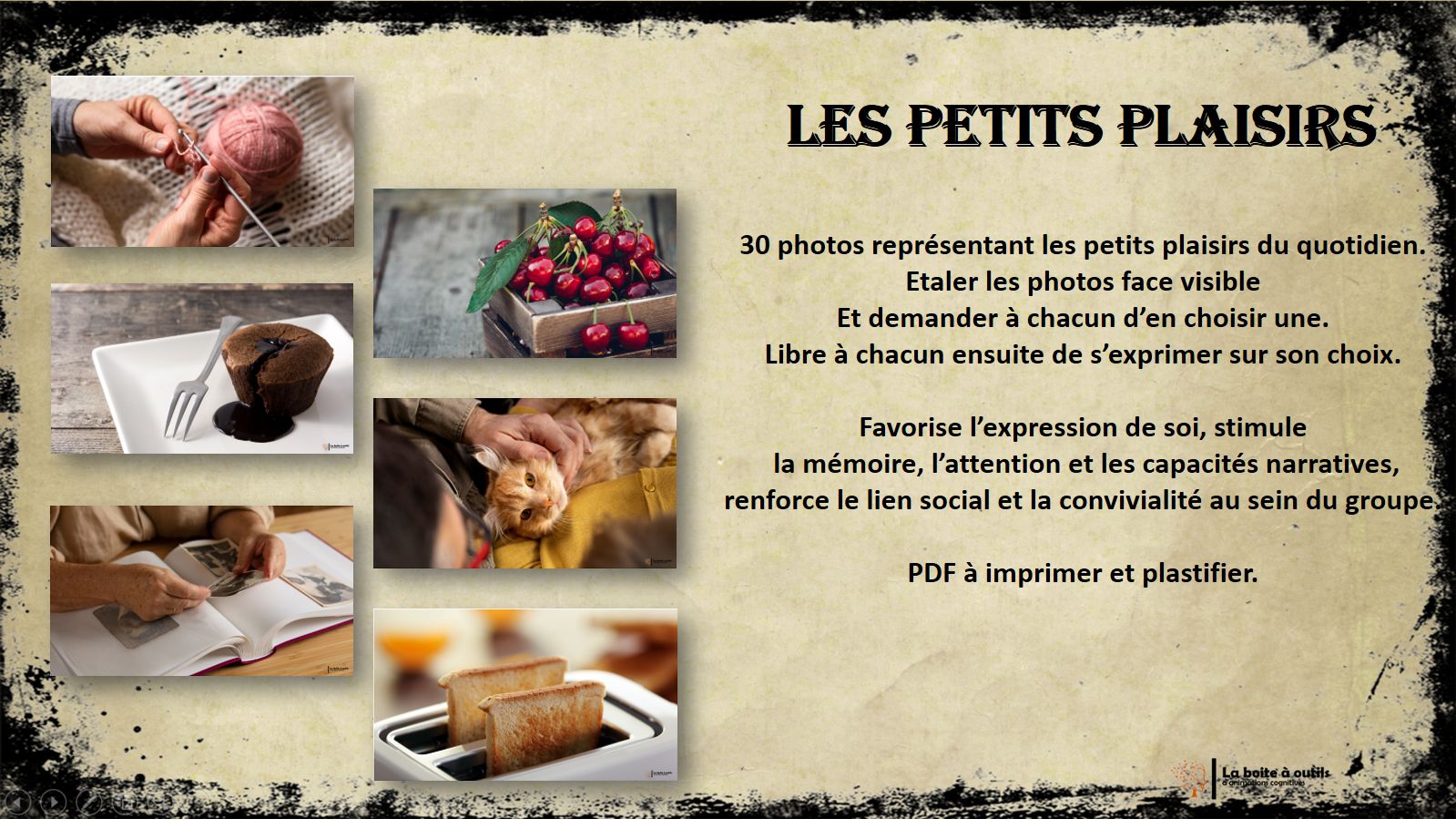 Outil très intéressant que j'ai adapté en utilisant uniquement les cartes (sinon trop de consignes pour des personnes ayant des troubles cognitifs).