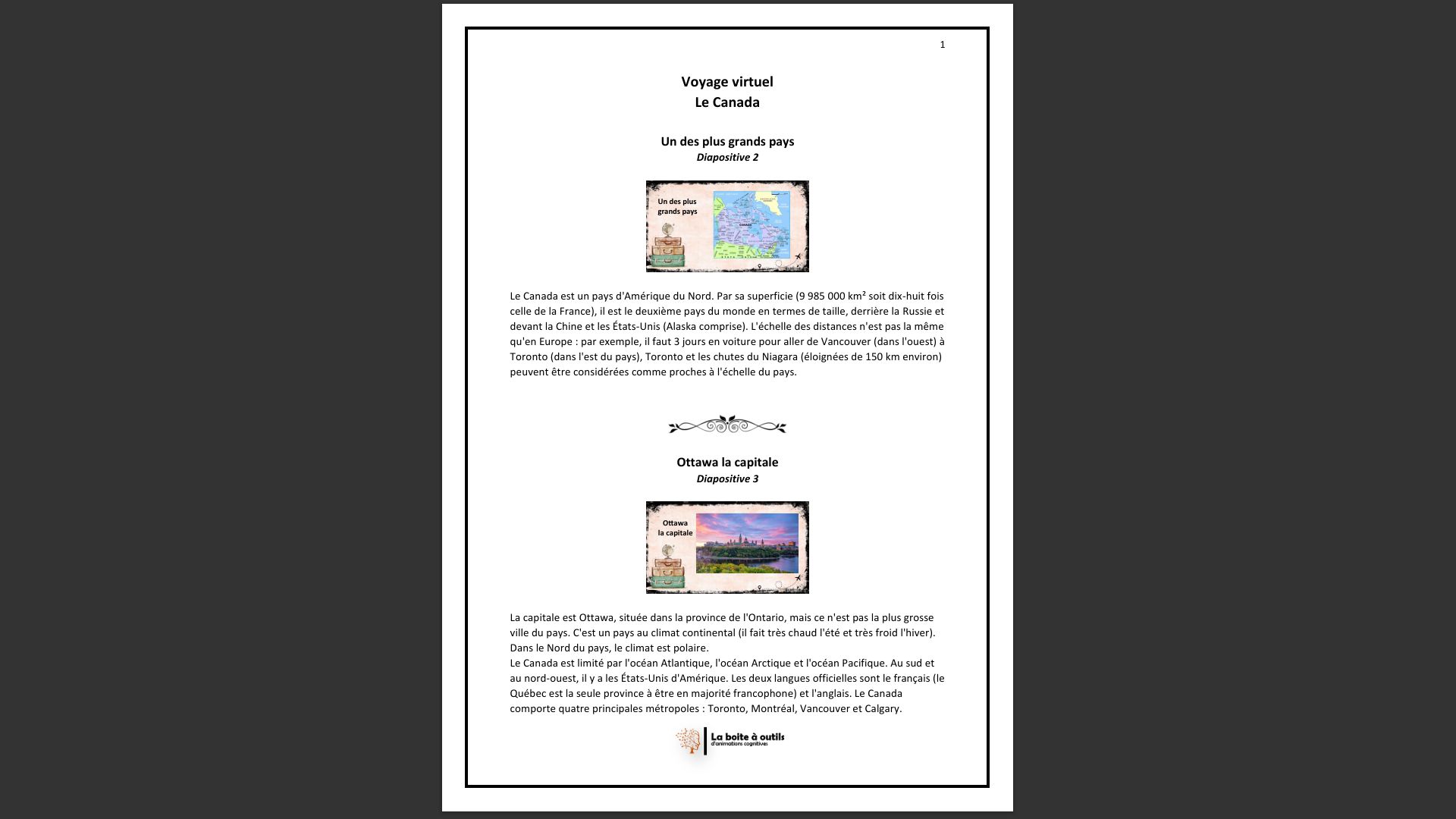 Super montage photos pour faire découvrir ou redécouvrir un pays qui amène la découverte, le dialogue, des souvenirs parfois en individuel ou en groupe..plus un quizz a la fin très bien fait..super boulot!!!un gain de temps énorme pour nous les animatrices