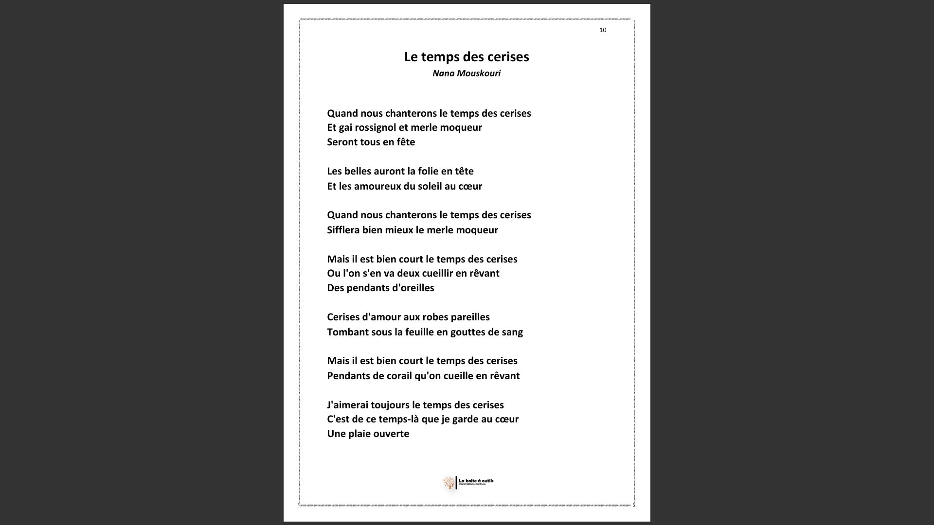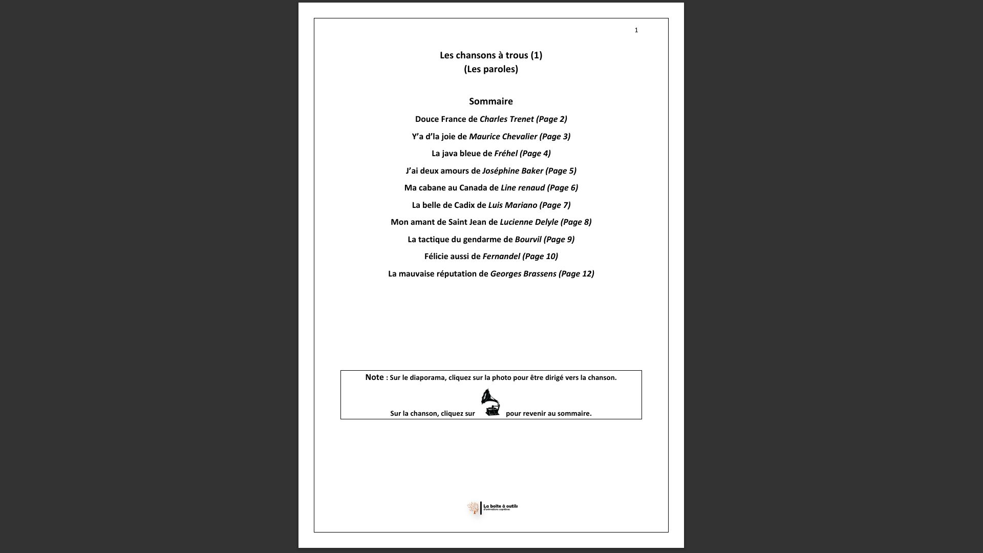 Le fichier contient 30 cartons en PDF à imprimer et plastifier ainsi qu’un diaporama comprenant les 54 extraits de chansons à découvrir.