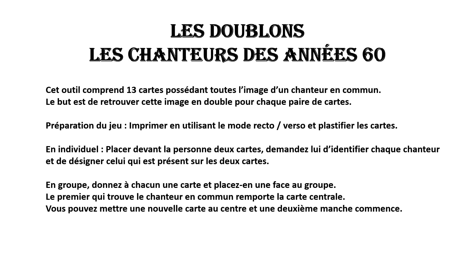 Il peut également servir d’outil de réminiscence auprès de personnes, les photos des chanteurs datant à peu près de leur époque.