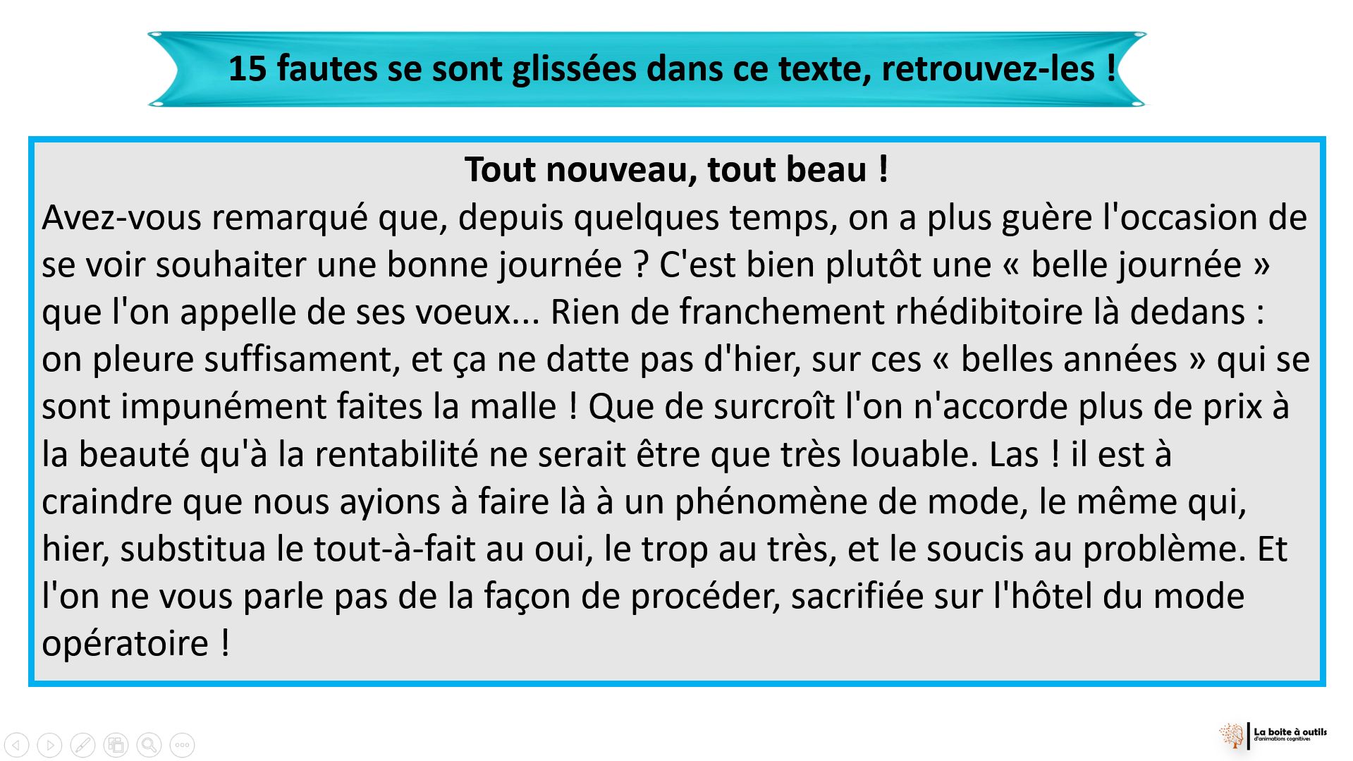 Cet atelier est conçu pour stimuler des personnes ayant un bon niveau cognitif.